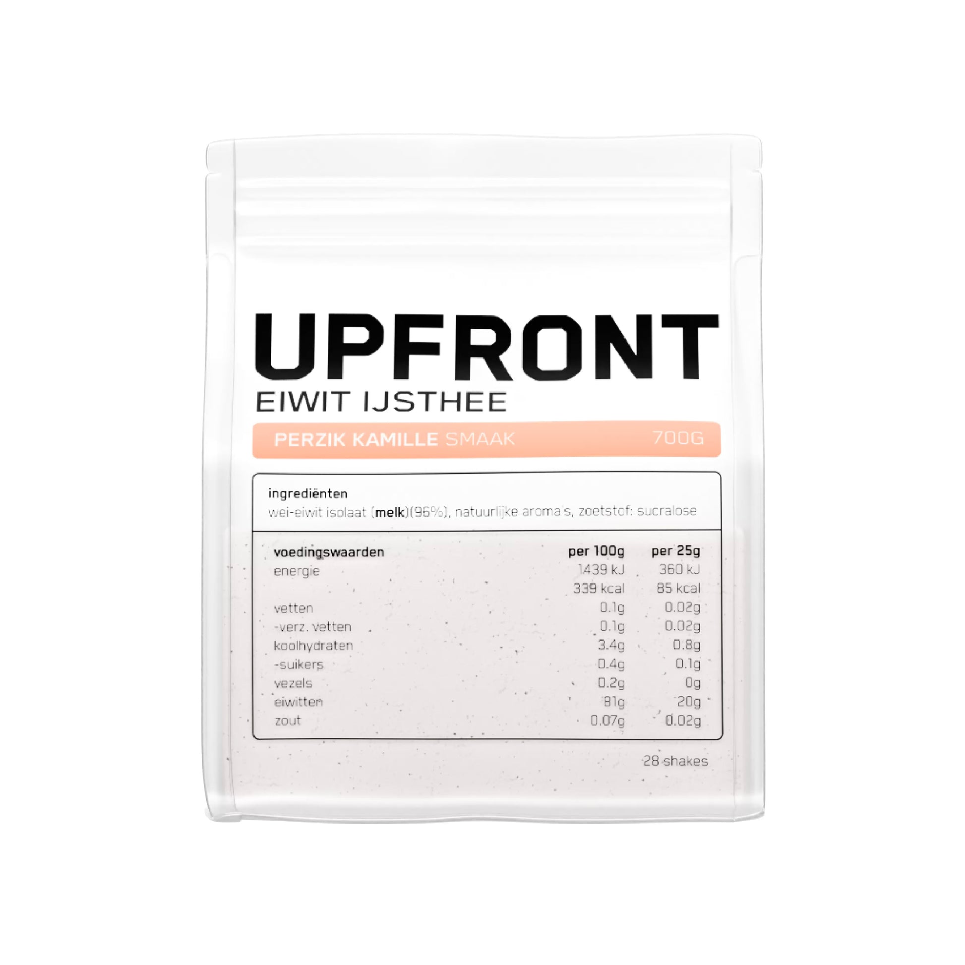 Een frisse eiwitdrank met de smaak van ijsthee, maar dan sportproof. Deze Upfront ijsthee combineert een zachte perzik-kamillesmaak met een lichte, doordrinkbare structuur. Ideaal na je training of als verfrissend eiwitrijk moment gedurende de dag.